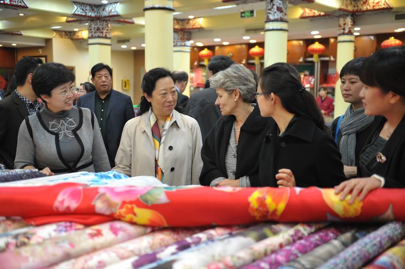 伊琳娜·博科娃參觀了楊梅竹斜街,對大柵欄更新計劃這一模式給予了充分肯定。隨后,伊琳娜·博科娃游覽了大柵欄商業(yè)街,她高度評價了古老而繁華的街區(qū)、老字號的精良工藝,并進入內聯升和瑞蚨祥參觀。