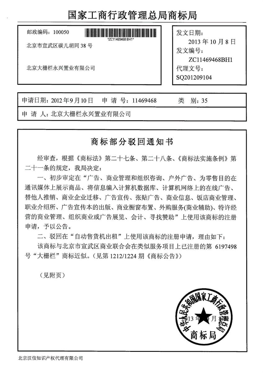 在永興置業(yè)申請(qǐng)的35類注冊(cè)“大柵欄圖形”商標(biāo)中除“自動(dòng)售貨機(jī)出租”這一項(xiàng)駁回,其余20項(xiàng)(1、廣告;2、廣告宣傳;3、計(jì)算機(jī)網(wǎng)絡(luò)上的在線廣告;4、戶外廣告;5、廣告宣傳本的出版;6、商業(yè)櫥窗布置;7、為零售目的在通訊媒體上展示商品;8、張貼廣告;9、商業(yè)信息;10、組織商業(yè)或廣告展覽;11、飯店商業(yè)管理;12、外購(gòu)服務(wù)(商業(yè)輔助);13、商業(yè)管理和組織咨詢;14、特許經(jīng)營(yíng)的商業(yè)管理;15、替他人推銷;16、職業(yè)介紹所;17、商業(yè)企業(yè)遷移;18、將信息編入計(jì)算機(jī)數(shù)據(jù)庫(kù);19、會(huì)計(jì);21、尋找贊助)已經(jīng)通過初審。