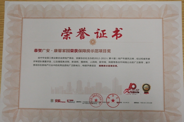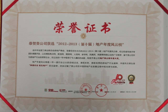 2013年1月18日,從全國(guó)工商聯(lián)房地產(chǎn)商會(huì)主辦的中國(guó)房地產(chǎn)業(yè)“2012-2013地產(chǎn)年度風(fēng)云榜”頒獎(jiǎng)盛會(huì)上傳來(lái)喜訊,北京廣安置業(yè)投資公司及廣安·康馨家園項(xiàng)目雙雙入選“2012-2013(第十屆)地產(chǎn)年度風(fēng)云榜”,置業(yè)公司喜獲2012-2013“民生地產(chǎn)功勛企業(yè)”、廣安·康馨家園項(xiàng)目獲得2012-2013“保障房示范項(xiàng)目”榮譽(yù)稱(chēng)號(hào),這是置業(yè)公司在2012年度所獲得的又一大獎(jiǎng),也是對(duì)公司及全體員工一年來(lái)的辛勤工作的肯定和鼓舞。此次盛會(huì)已經(jīng)引起了國(guó)內(nèi)房地產(chǎn)行業(yè)眾多公司及知名行業(yè)人士的關(guān)注和參與,全國(guó)300多家媒體對(duì)此次盛會(huì)進(jìn)行了跟蹤報(bào)道。