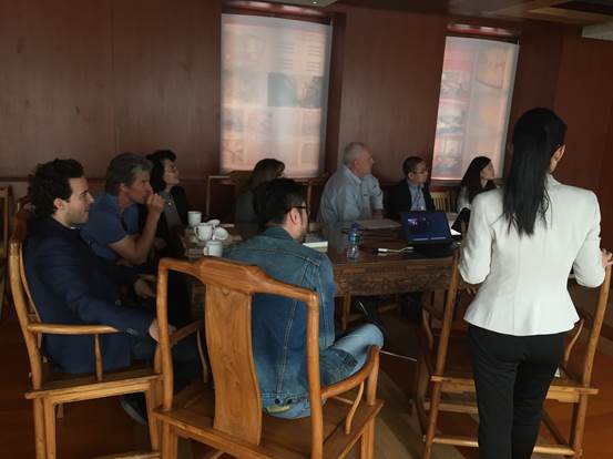 廣安置業(yè)營(yíng)銷總監(jiān)沈紅梅一行向來(lái)訪人員介紹了項(xiàng)目的定位與特點(diǎn),項(xiàng)目理念、設(shè)計(jì)細(xì)節(jié)以及富有民國(guó)特色的建筑風(fēng)格,得到了好萊塢電影大師的一致好評(píng),紛紛饒有興趣的詢問(wèn)相關(guān)信息、拍照留用。Jonathan Bollier表示北京坊項(xiàng)目令人驚艷,Phil Lengyel甚至開(kāi)玩笑的表示希望能在北京坊擁有一間自己的辦公室。